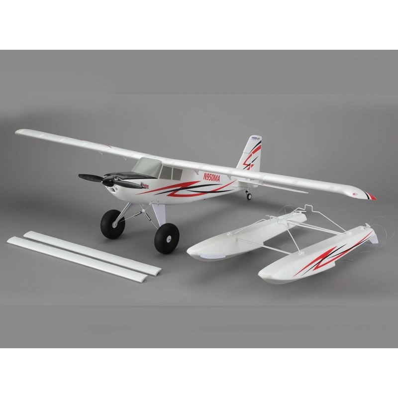 Thick grass, gravel paths, local ponds, dirt trails-you can fly off these and many other surfaces that would be impossible for most models this size to handle. The Tundra-style landing gear features functional shock absorbers and oversized tires that soak up the bumps of rough surfaces and provide excellent prop clearance when flying off grass. The included float set matches the trim scheme of the airplane and features dual rudders for superb steering control.