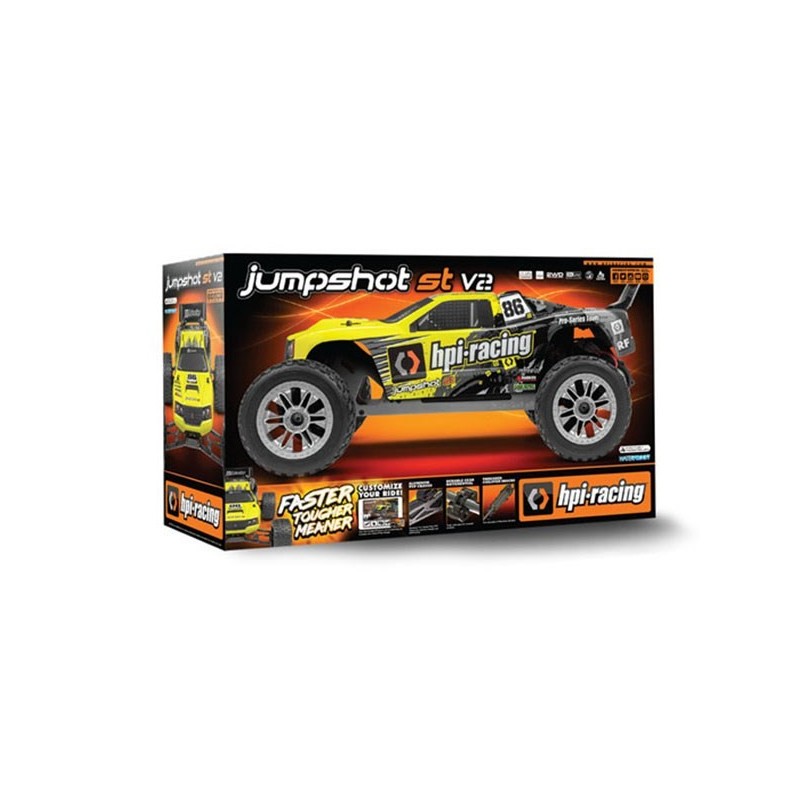 Underneath the sleek racing body of the Jumpshot ST V2, the chassis is a Savage-style TVP (Twin Vertical Plate) design for a super-stiff chassis and center-balanced weight. The modular design of the chassis gives you simple maintenance and durable crash protection for all the electronics. The battery is quickly accessed from underneath the truck, so changing batteries is extra-fast for more driving fun! The Jumpshot ST V2 has also been updated with a brand new look that is bright and sure to grab the attention of all your RC friends!